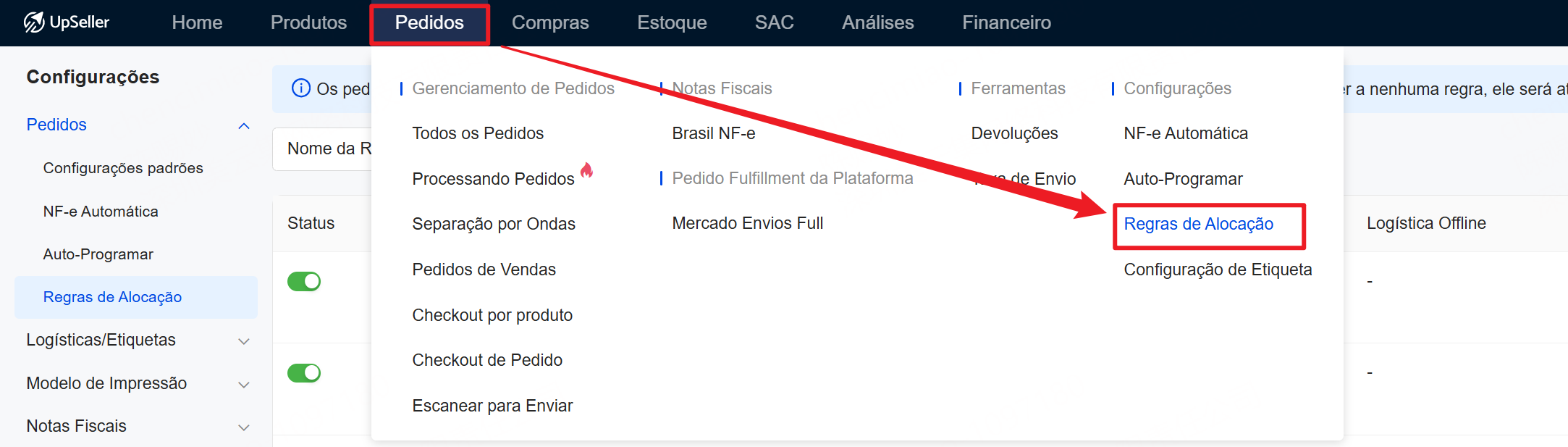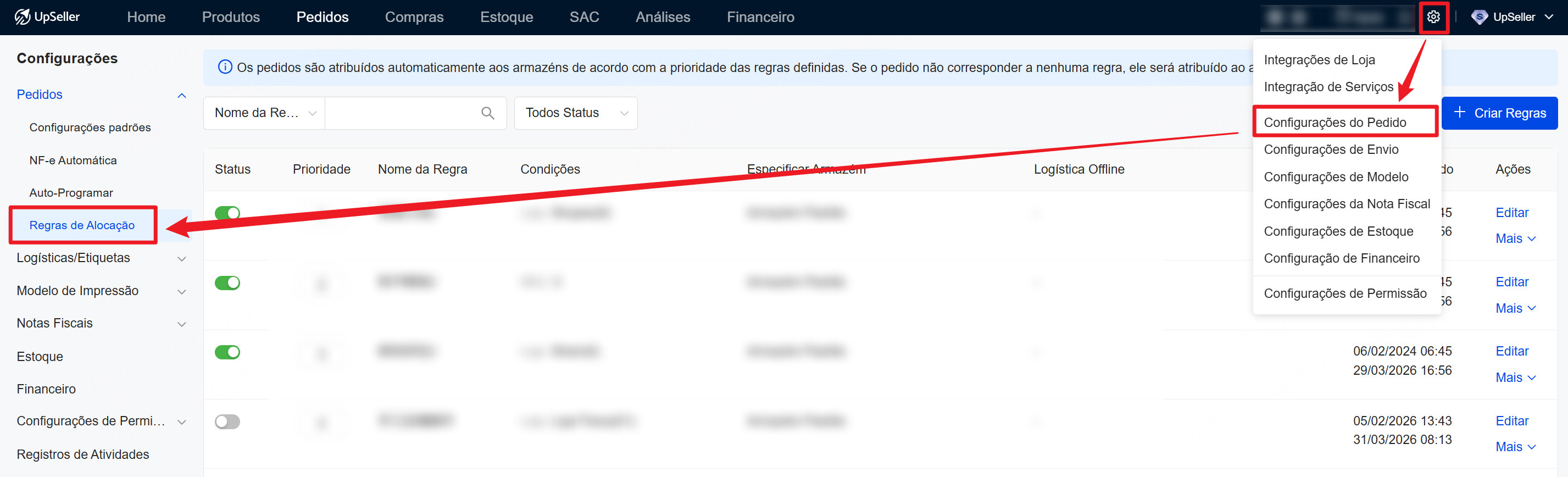 Entrada 2: Clique no módulo Pedidos >> Configurações >> Regras de Alocação