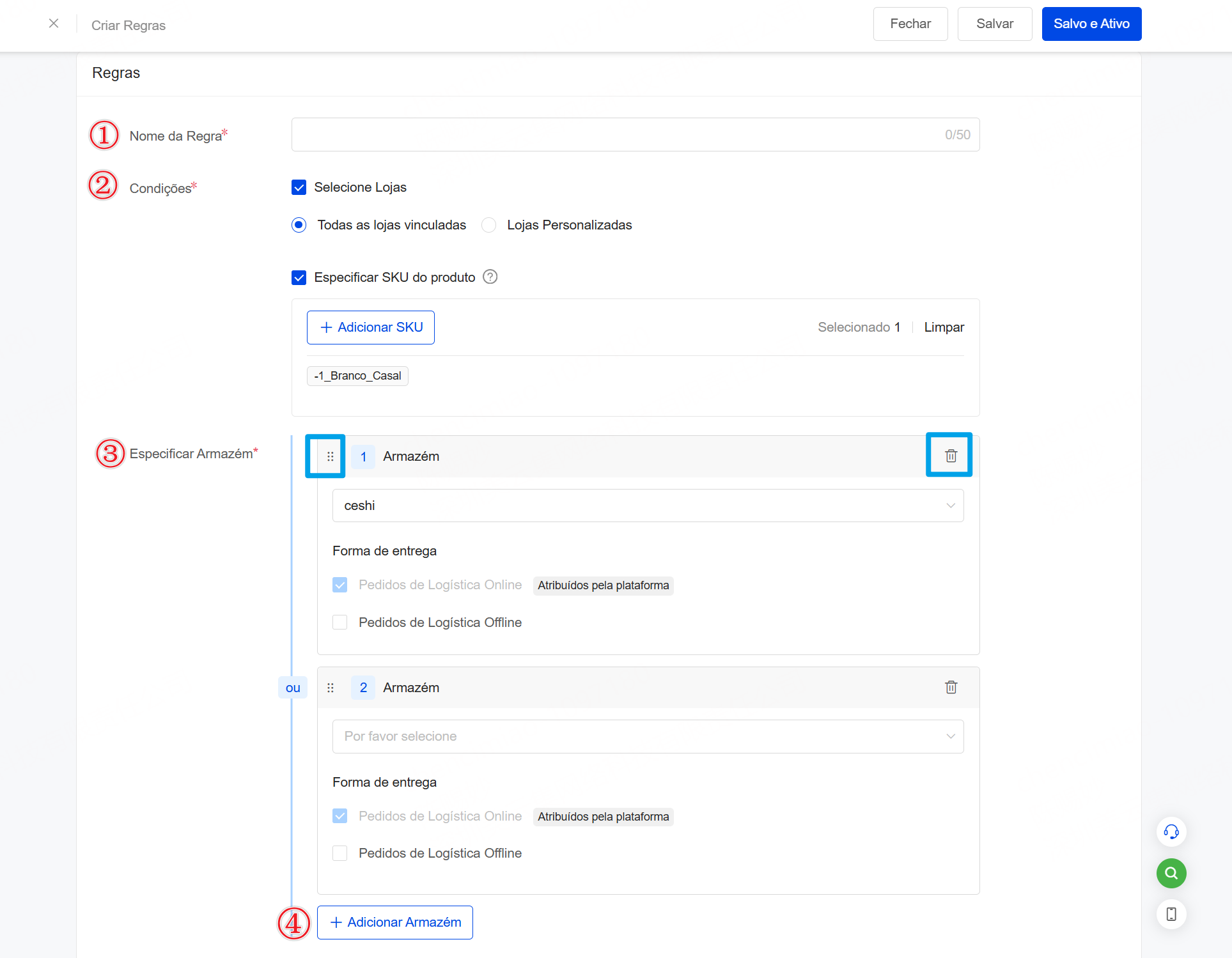 Regra 1 (Prioridade mais alta): Condição: Loja Shopee 1 + SKU do Produto = A, Aloca para Armazém Test.