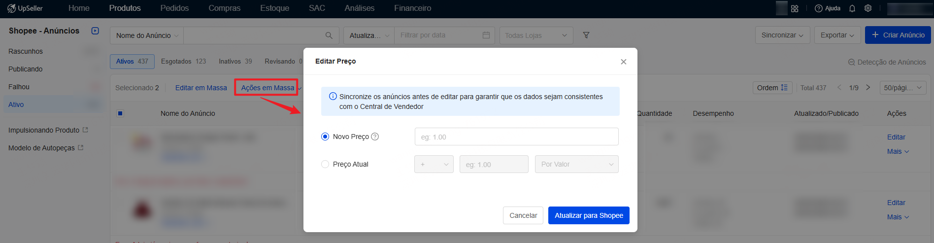 Com a nova estrutura de comissões, muitos vendedores precisarão recalcular margens e ajustar preços em múltiplos SKUs. Fazer isso manualmente produto por produto reduz a eficiência e aumenta o risco de erros. Com o UpSeller ERP, é possível editar em massa de preços, permitindo atualizar rapidamente centenas ou milhares de anúncios em poucos minutos.