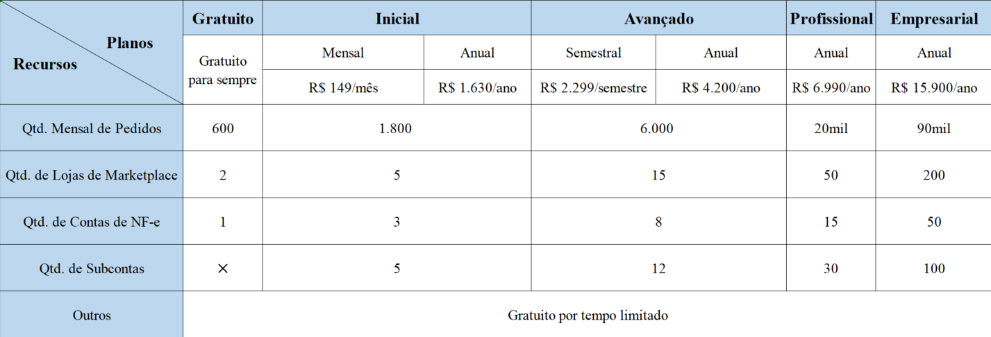 Após o lançamento da versão paga, a funcionalidade de NF-e não será mais cobrada separadamente. Os saldos de notas fiscais restantes serão convertidos em automaticamente em vouchers e pacotes adicionais de pedidos.