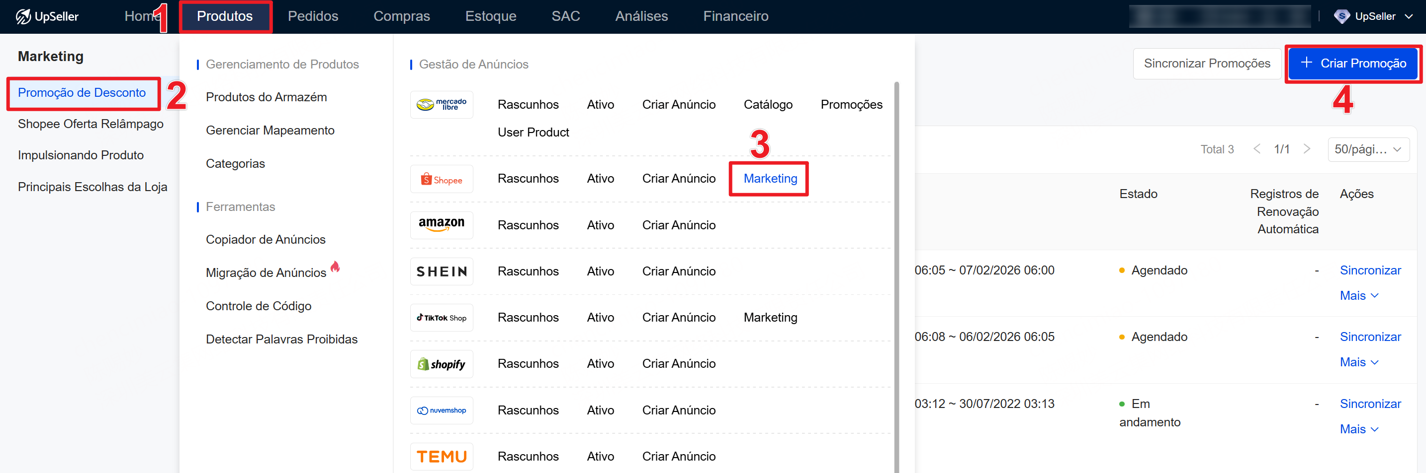 1. Assim como na opção "Promoção de Desconto" da Shopee, é possível configurar promoções de desconto para anúncios no UpSeller, ajudando a aumentar as vendas.