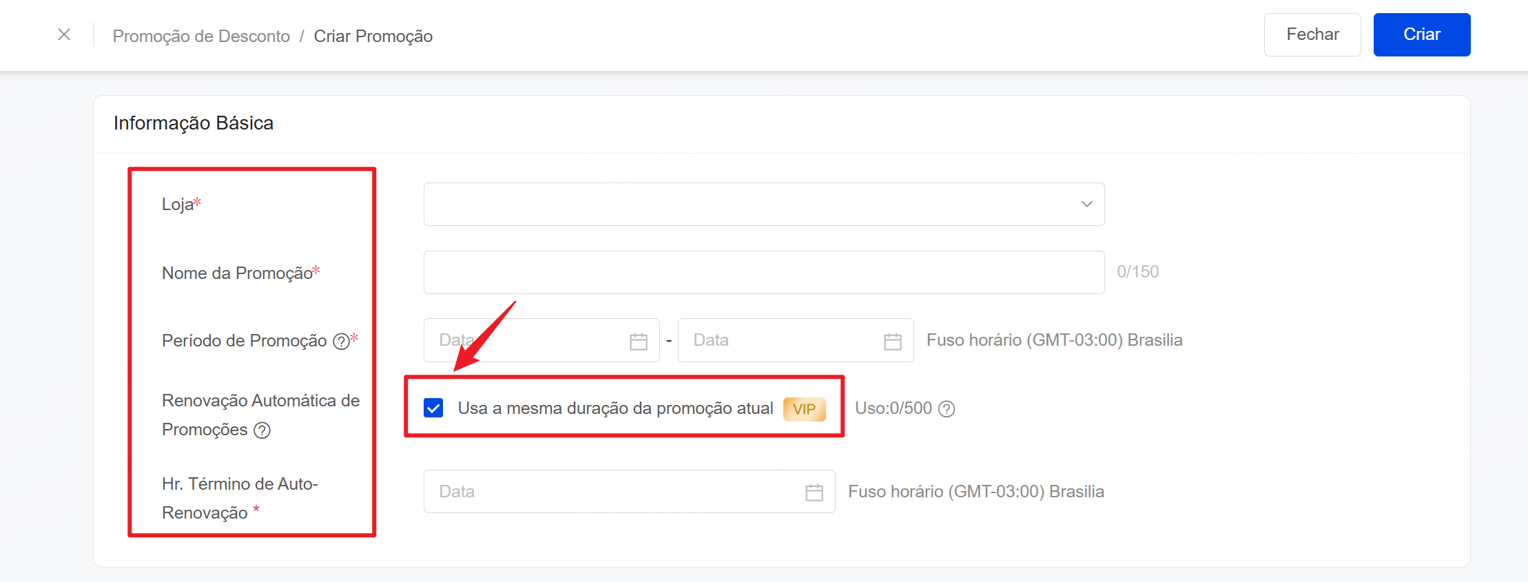 2. Preencha as informações básicas da Promoção de Desconto e, se desejar, marque a opção "Usa a mesma duração da promoção atual"