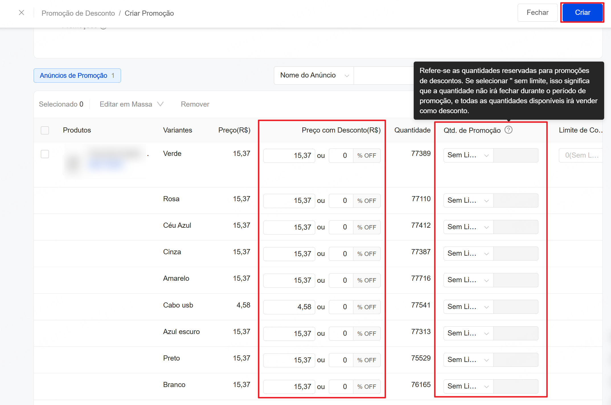 4. Defina o preço com desconto e o estoque reservado para a promoção >> Clique em "Criar" para concluir a criação da promoção de desconto