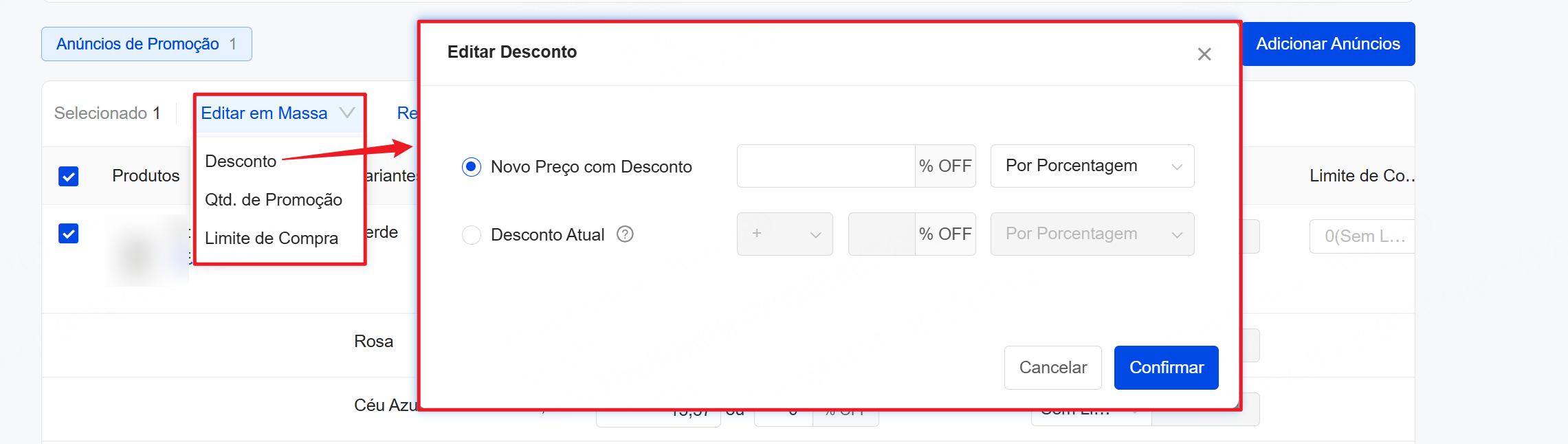OBS: na edição em massa, é possível definir o desconto atual por valor fixo ou percentual. Também é possível ajustar o desconto aumentando ou reduzindo o percentual ou o valor. O estoque promocional pode ser configurado conforme a necessidade.
