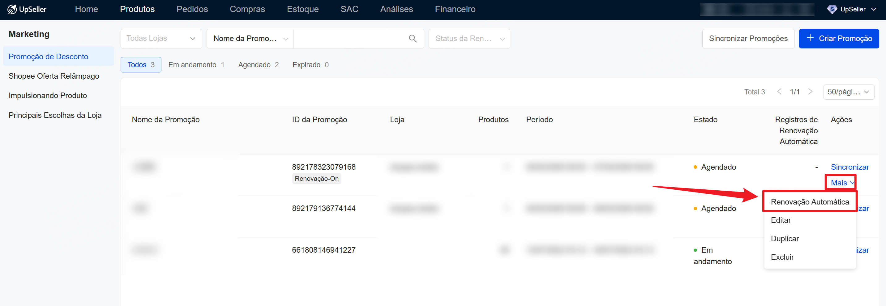 OBS: Promoções de desconto já criadas também podem ter a renovação automática ativada: Clique em Mais >> Renovação automática