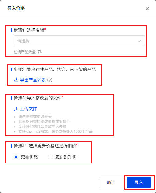 • 支持xlsx、xls格式,最多支持导入1000个产品