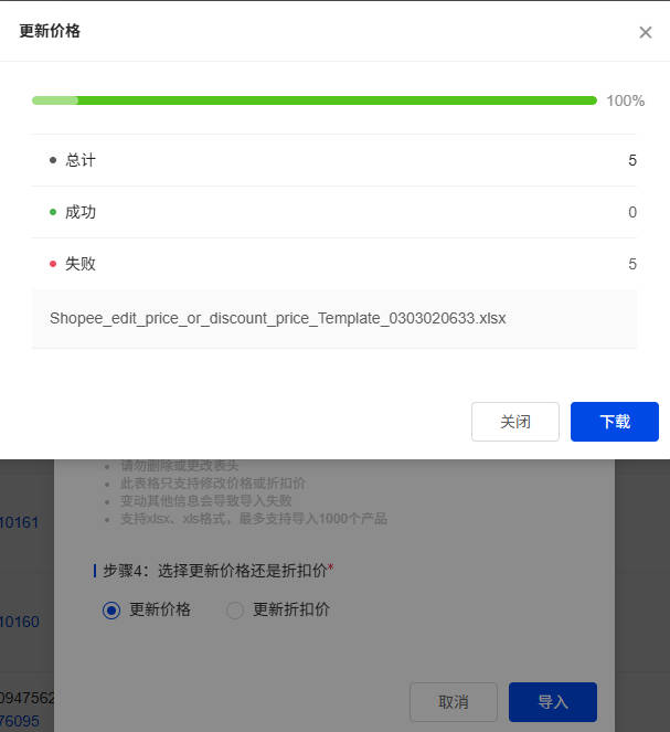 当选择“更新价格”时,仅更改产品价格;当选择“更新折扣价”时,仅更改产品的折扣价,同时,Shopee营销管理中参加活动的折扣价也会相应修改。