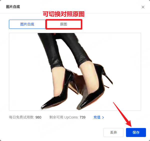 第三步:图片处理成功后,可切换对照原图查看,点击“保存”即可应用